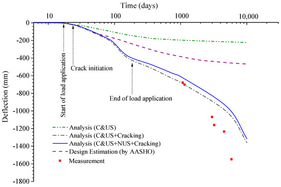 In Figure 20, the analysis results are compared against the measured data (shown by the red squares) and the original design calculation (shown with the purple line). The original estimation of the deflection was calculated using a simplified approach based on the American Association of State Highway Officials design guidelines [26]. In this approach, the creep and shrinkage are assumed to start after the completion of bridge construction. Accordingly, the elastic deflection owing to all permanent loads is calculated first, and the long-term deflection is estimated by multiplying the elastic deflection by the assumed creep coefficient. The total elastic deflection after an assumed 10% prestress loss was 370 mm, and multiplying this by a creep coefficient of 1.3 gave the final long-term deflection as 481 mm.