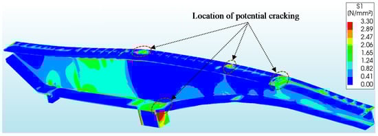 The cracking starts at the face of the second pier and at a location 66 m away from that point, as shown in Figure 21. The principal stress exceeds the tensile strength of concrete, i.e., 3.2 MPa. This is in good agreement with the report by Tang [26], i.e., cracking and failure occur near the same location.