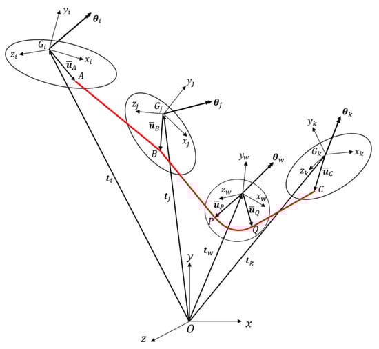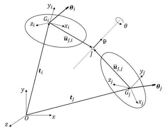 Since the work of the internal forces is considered, the equation of motion (22) is satisfied for any virtual displacement : in order to refer the bodies’ orientations to the local cartesian angular coordinates , instead of the quaternion , a coordinate change is performed through the matrix [], in (17).