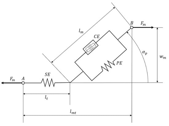 The Hill muscle model considers the muscle–tendon unit as a linear actuator between two attachment points and on the linked bodies (Figure 3) composed by the series of the tendon SE with length and the muscle, that is modelled as a parallel between the contractile element CE and the passive element PE, with length and inclined with respect to the action line by the pennation angle [,,].