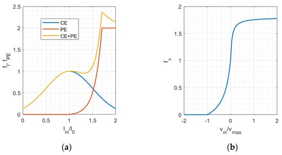 The force generated by the muscle–tendon series is shared by the tendon and the muscle, so it can be evaluated as the sum of the ones generated by the contractile element , representing the active action due to the sarcomeres’ contractions, and the passive element , due to the muscular fibre tissue stiffness, projected on the action line through the pennation angle . The active part depends on the activation level , a scalar number between 0 and 1 determined by the muscular recruitment criterion, the muscle fibre length and deformation velocity through the force–length–velocity relationships, while the passive force depends only on the muscle fibre length [,,], as written in (20) and depicted in the Figure 4: