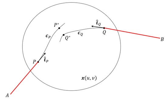 The objective is to find the unknown geodesics initial positions, the attachment points locations described by the surface parameters and , that set to zero the function in (25), in which the first two components impose the surface’s tangency of the split muscles, while the last two components guarantee the geodesics’ collinearity. The non-linear closed problem can be solved using the Newton iterative method, numerically calculating numerically the Jacobian function .