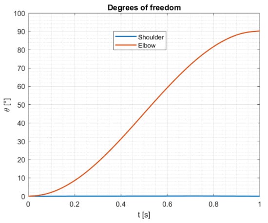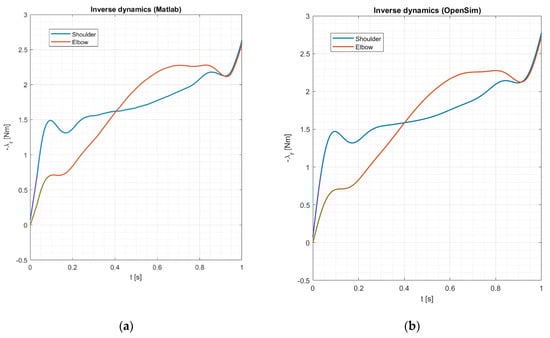 In this section, the results regarding the simulation of the upper limb subjected to gravity during a simple kinematics are discussed. The input data are taken from the OpenSim model “arm26” []. As already mentioned, the analysed upper limb is composed of three bodies: ground, humerus and forearm; these are linked by two revolute joints, the shoulder and elbow, whose main data (inertial properties, relative locations and rotation axes) are listed in Table 1, Table 2, Table 3 and Table 4.