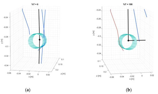 Once the muscle path is defined, the muscle forces have to be turned into generalised forces through the muscle Jacobian by the principle of virtual work in order to include them in the equation of motion [,,]. In general, each muscle is modelled as a series of straight-line and curved musculotendon actuators (Figure 6), so the muscle’s virtual work is calculated with the sum of the individual units work considering that the muscle force is constant along the muscle path and that there is no friction between the muscle path and the wrapping surfaces [].