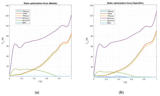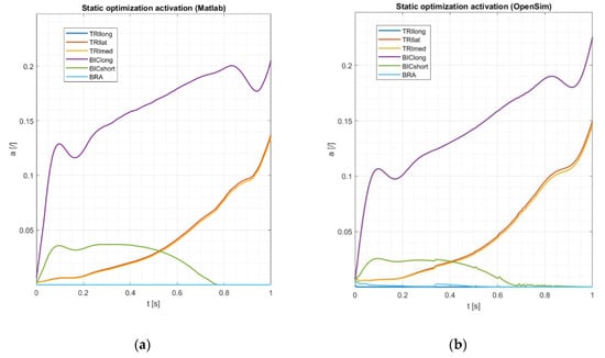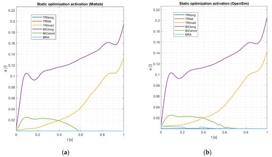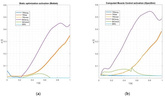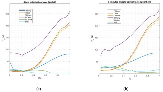 From Equation (20), each muscle force is written in Equation (31) as the sum of an active part multiplied by the activation level and a passive part , in order to relate the muscle force vector to the activation vector , through the maximum active muscle force , and the passive muscle force vector (which take into account the muscles’ length, velocity, pennation and maximum isometric force).