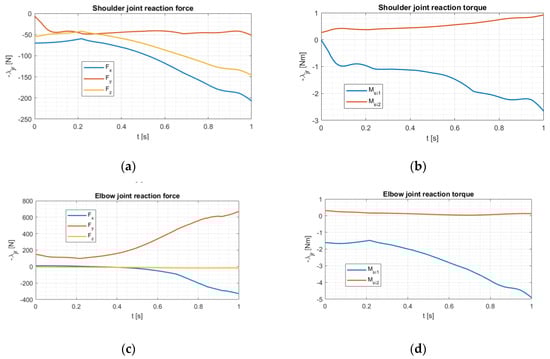 Once the inverse dynamics problem of the musculoskeletal system is solved, the Matlab model provides the joint reactions. In Figure 20, the joint reactions (which are the scleronomic Lagrange multipliers of Equation (33)) which act on the upper limb joints during the analysed kinematics are shown.