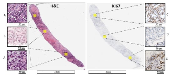 - Besusparis, J.; Plancoulaine, B.; Rasmusson, A.; Augulis, R.; Green, A.R.; Ellis, I.O.; Laurinaviciene, A.; Herlin, P.; Laurinavicius, A. Impact of tissue sampling on accuracy of Ki67 immunohistochemistry evaluation in breast cancer. Diagn. Pathol. 2016, 11, 82. [Google Scholar] [CrossRef] [PubMed]