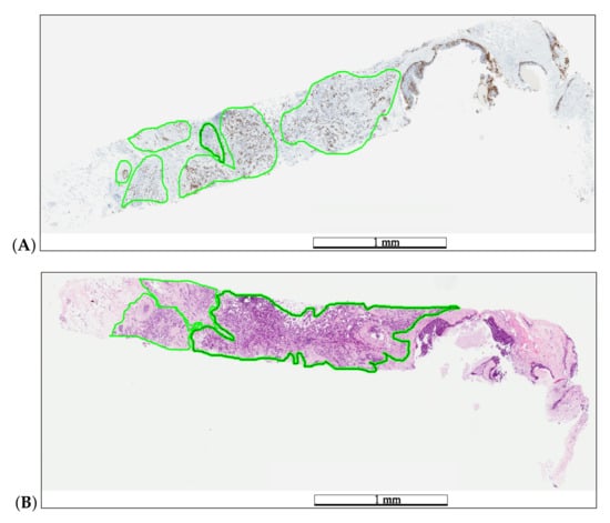 Each WSI was reviewed by pathologists participating in the AIDPATH project. These pathologists generated the ground truth annotations for tumor (H&E) and hot-spot (Ki67) areas (Figure 2) using the Aperio ImageScope software ver.12.3. Next, the pathologists evaluated the Ki67 LI.