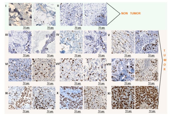 Figure 3. Example of tiles extracted from the KI-67 stained images: (I) non-tumor class, (II) lymphocytes, and (III–XI) tumor classes with several progressive tumor proliferations. The length bars shown in the tiles are 50 m.