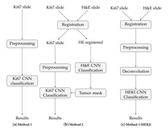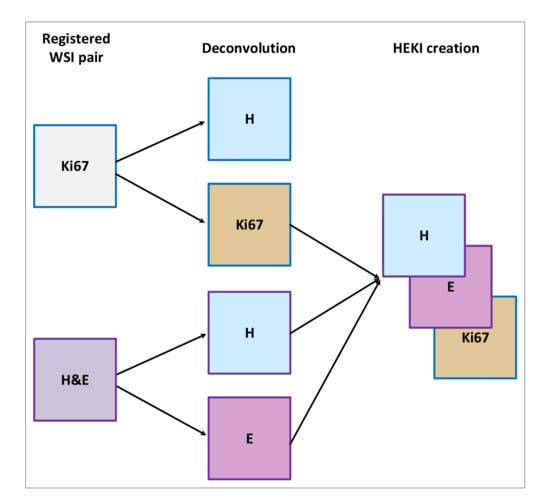 In our study, we developed and compared three strategies: the basic one (using only the Ki67 dataset) and two that use the H&E and Ki67 datasets. The idea of using the H&E and Ki67 datasets was inspired by the routine work of pathologists, who observe HE and KI67 stained slides to evaluate the specimens. In routine practice, pathologists have 2 separate slides—one stained with HE and one stained with KI67; based on this, the pathologists then perform an analysis. This approach is modeled as the second method. In the third developed method, we used the computational power and deconvolutional technique to merge HE and KI67 stained slides into one artificial “HEKI” image. All approaches are based on Deep Learning and were developed to explore the possibilities of combining information from several stains. The proposals follow a three-step workflow: (a) tissue area segmentation, (b) hot-spot detection, and (c) Ki67 LI evaluation. All methods were developed using Matlab [37], and the calculations were performed on a computer with an Nvidia Quadro 400 graphics card and Cuda version 8.0.