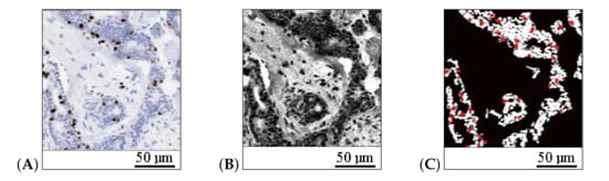 The detection of cancer regions and cells: (A) hot-spot area, (B) image in gray scale after histogram normalization, and (C) detected tumor area (white) and immunopositive cells (red). The length bars shown in the sample images are 50 m.