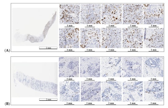 The final value of Ki67 LI is the average value of for 10 hot-spot fields. The hot-spot fields were selected from the hot-spot map created in the first step from the FOV with the highest classification results. An example of automatically selected hot-spot fields is presented in Figure 7.