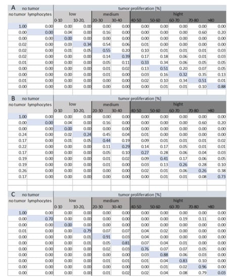 - The Ki67 data were divided into 11 classes: non-tumor areas, lymphocytes, and 9 classes with tumor areas (Figure 3). The lymphocyte class was added to this analysis to avoid the false positive regions generated by its high proliferation. The tumor areas were divided into 9 groups based on the tumor proliferation factor, which was calculated as the ratio between immunopositive cells (brown cells) and all tumor cells (brown and blue cells). The detection of all tumor cells was performed using the cell detector developed by Markiewicz et al. [35].