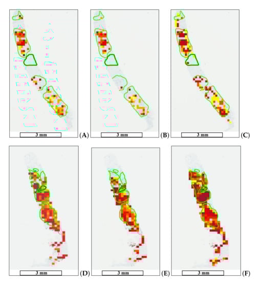 Automatic tumor proliferation map examples: (A,D) maps for Method 1, (B,E) maps for Method 2, and (C,F) maps for Method 3 (HEKI). High tumor proliferation areas are marked in red (dark red), whereas areas with low tumor proliferation are marked in yellow. The length bars shown in the WSIs are 3 mm.