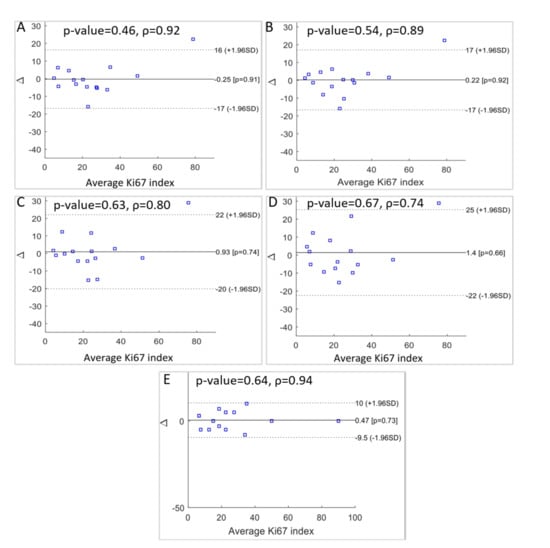 To evaluate the variations between medical estimations and the automated Ki67 LI process, three statistical tests were performed: the Bland–Altman plot, one-sided t-test, and Spearman’s correlation. The Bland–Altman test allows one to compare two quantitative measures by setting agreement limits. These statistical limits are determined using the mean and standard deviation of the two measures.