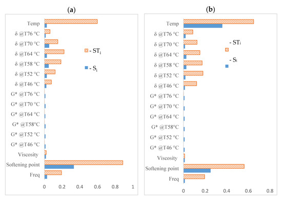 Sobol indices obtained for fatigue model using (a) unaged parameters and (b) RTFOT parameters.