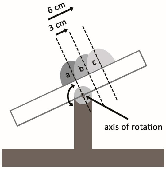 A frontal-plane schematic of the apparatus that enabled simulating different ski waist-widths. The elliptic shapes represent the left/outside ski-boot in the simulated right ski-turn. The axis of rotation (pointed by the arrow) represents the inner edge of the left (outside) ski. The simulated width of the ski is equal to the doubled distance between the axis of the rotation (ski edge) and the mid of the boot. The positions “b” and “c” simulated the 60 and 120 mm ski waist-widths, respectively. The position “a” is nonrealistic and was used only to collect reference values. The computer-guided electromotor (not shown on the schema) moved the platform with the ski-boot-binding system between the presented positions.