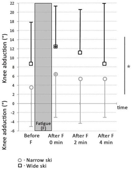 After fatigue, there was significant increase in knee abduction with narrow skis (t = −2.16; p = 0.05; d = 0.31), as well as with the wide ones (t = −2.39; p < 0.05; d = 0.41).