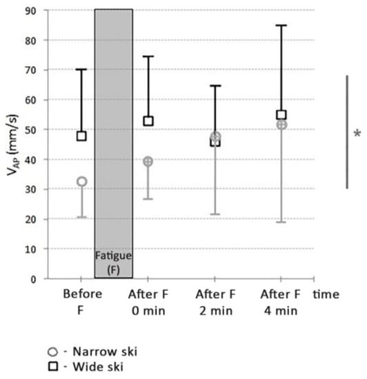The VAP value for wide skis was significantly higher compared to that for narrow ones (t = −3.44; p < 0.01; d = 0.52). With narrow skis, all three after fatigue VAP values were significantly higher compared to the prefatigue value with the immediate after fatigue value being the highest (t = −2.70; p < 0.05; d = 0.42).