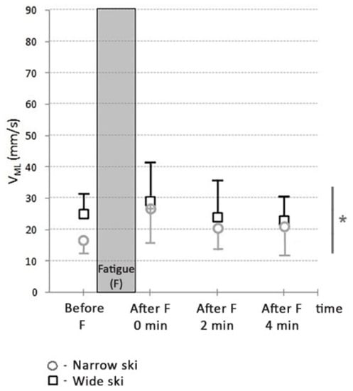 CoP velocity in mediolateral direction (VML) in a prefatigued state (before F) and at different times after fatigue (after F) with two different ski waist-widths. + depicts statistically significant difference compared to prefatigued state (p < 0.05); * depicts statistically significant difference between all-narrow against all-wide waist-width measurements.