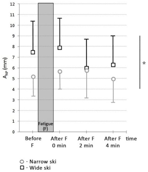 The AAP values were significantly higher with wide skis compared to narrow ones (t = 2.23; p < 0.05; d = 0.31). The differences between pre and after fatigue times were significant with wide skis only (F = 4.28; p < 0.05; η2 = 0.28). There was a decrement in AAP value 2 min after fatigue compared to the state immediately after fatigue (t = 2.92; p < 0.05; d = 0.38).