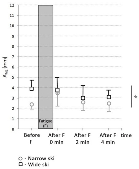The effect of time of measurement was statistically significant for narrow skis only (F = 5.00; p < 0.01; η2 = 0.31) and AML was significantly higher only immediately after fatigue (t = −3.44; p < 0.01; d = 0.52).