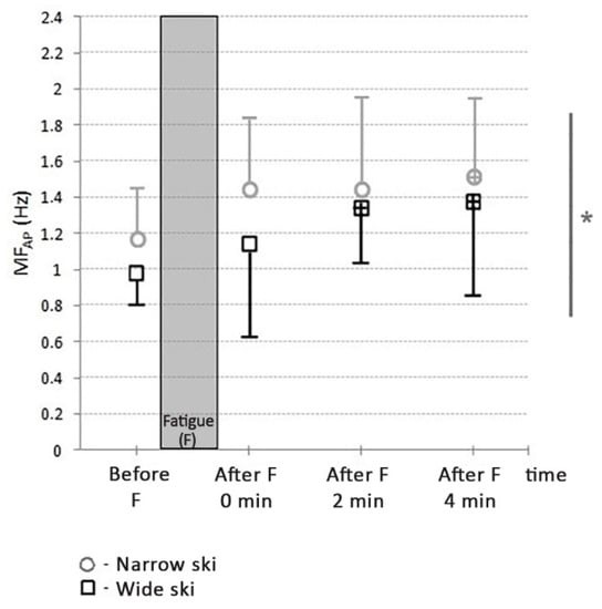 Significant differences were observed in MFAP with different ski widths (F = 5.93; p < 0.01; η2 = 0.37). The MFAP value was significantly lower with wide skis compared to the narrow ones (t = 2.86; p < 0.05; d = 0.43) (Figure 9).