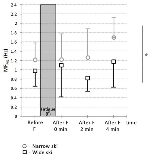 MFML was significantly lower with wide skis compared to narrow ones (t = 2.33; p < 0.05; d = 0.31). With narrow skis, there was a significant increment in MFML values 4 min after fatigue compared to the prefatigue state (t = −3.85; p < 0.01; d = 0.55), as well as 4 min after fatigue compared to immediately after fatigue (t = −2.73; p < 0.05; d = 0.40). With wide skis, there was significant difference in MFML value only 4 min after fatigue compared to values 2 min after fatigue (t = −2.33; p < 0.05; d = 0.31).