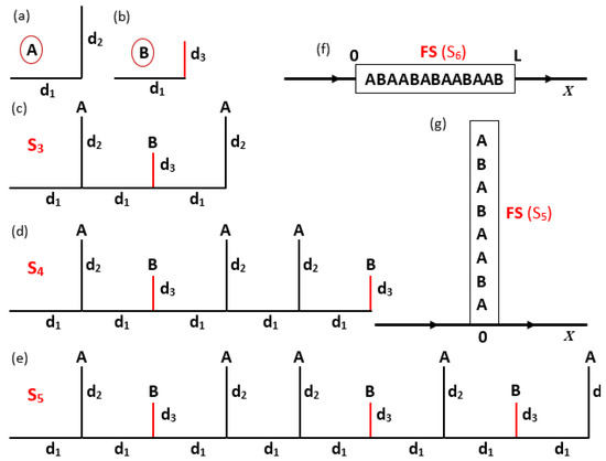 Schematic representation of blocks A and B constituting the Fibonacci structure. (a) The block A consists of a horizontal coaxial cable of length combined with another identical vertical stub of length (). (b) The Block B is similar to the block A but with the length of the vertical stub of length . All cables are characterized by the same impedance Z. (c–e) give the shape of the Fibonacci sequences , and respectively. (f) A finite Fibonacci structure (6th generation) inserted horizontally between two semi-infinite waveguides. (g) A finite Fibonacci structure (5th generation) grafted vertically along a waveguide.