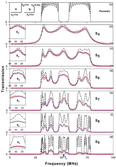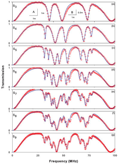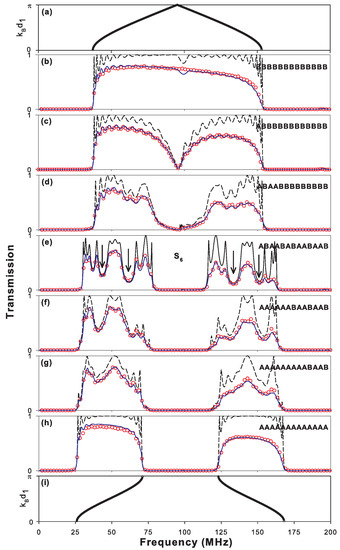 Similarly, in the case of a periodic structure composed of A blocks (i.e., m), then Equation (14) becomes simply /2. The band-gap edges are given by or equivalently . Therefore, the band edges are given by [mod. ]. The first four band limits fall at MHz, MHz, MHz and MHz, in accordance with the dispersion curves sketched in Figure 2i inside the first Brillouin zone. The transmission spectra through a finite periodic structure composed of 13 A blocks is plotted in Figure 2h. Here also, the allowed (forbidden) transmission spectra coincide perfectly with the bands (gaps) of the infinite system (Figure 2i) and the band gaps are periodic every (i.e., MHz).