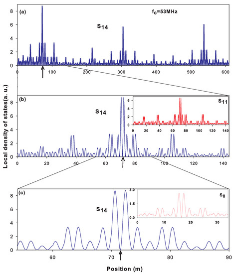 (a–c) Represent the spatial representation of the local density of states (LDOS) [in arbitrary units] of the mode lying at the central frequency MHz for the 14th generation. The insets of (b,c) correspond to the LDOS associated with the 11th and 8th generations at , respectively.