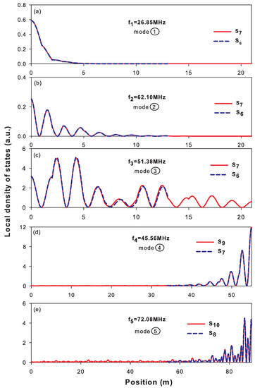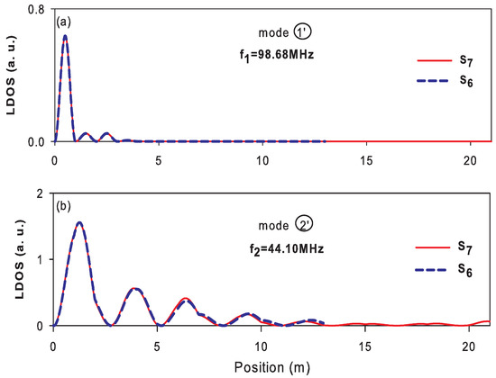 The LDOS (in arbitrary units) versus the space position x of the modes labeled 1 and 2 in Figure 10 at MHz (a) and MHz (b), respectively. Dashed (solid) curves correspond to the 6th (7th) generation.
