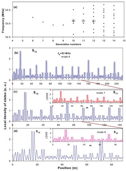 It has been found that the localization of modes in a Fibonacci structure exhibits critical behavior within the structure [80]. Indeed, contrary to disordered systems, these modes decrease according to a power law instead of an exponential law and the localization of these modes displays the property of self-similarity [81]. In order to understand the spatial localization of the different modes in Figure 3 and Figure 4a,c illustrate the local density of states (LDOS) versus the space position x for the modes located at central gap frequency MHz for generations , and respectively. The LDOS reflects the square modulus of the electric field inside the structure. The LDOS shows a self-similarity behavior [31,82] around the main peak every three generations as it is shown in the insets of Figure 4b,c displayed for the 11th and 8th generations respectively. These results show that the electric field around the central frequency is neither extended nor localized. This particular field localization, which is due the quasi-periodicity arrangement of the blocks A and B in the FS, has been explained by a multifractal analysis to understand the critical behavior of such modes [31,50,62,81,83].