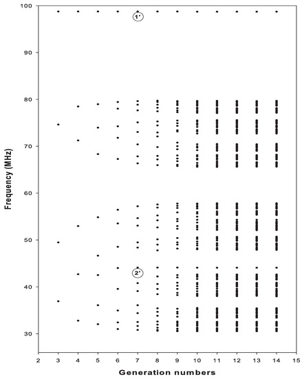 In the following, we will discuss the case where the Fibonacci sequences are grafted vertically to an horizontal waveguide (Figure 1g). The choice of this geometry is motivated by the fact that the maxima and minima of the transmission spectra permit to deduce all the eigenmodes of the structure [70,71]. As mentioned in Section 2, the transmission maxima occur for the eigenfrequencies of the finite FS when the boundary conditions at its both ends are perfect magnetic conductor type (i.e., vanishing magnetic field). However, the transmission minima occurs for eigenfrequencies of the finite Fibonacci sequence when the boundary conditions are perfect magnetic conductor type on the free surface of the structure and perfect electric conductor type (i.e., vanishing electric field) on the other side which will be grafted on the waveguide. The evolution of the transmission versus the frequency is displayed in Figure 6 for the generations –. It is shown that there are transmission oscillations between minima and maxima within the frequency range from 30 and 80 MHz. In addition, the theoretical results (solid curves) are in good agreement with the experimental ones (open circles). As predicted, these findings clearly show that the eigenmodes of the FS falling essentially inside the frequency region [30–80] MHz, where the transmission spectra of the horizontal Fibonacci structure is more pronounced (see Figure 3). The frequencies corresponding to the maxima of the transmittance (Figure 6) are reported in Figure 7 by dots for different generations. As a matter of completeness, Figure 7 displays the theoretical results for the generations –. The experimental spectra of these high order generations are difficult to measure as the modes become very close to each other (Figure 7). As predicted, the number of eigenmodes of a FS increases with increasing the generation number. One can notice that, apart surface modes falling in the forbidden bands at the same frequency for all generations or for one generation over two, the other modes accumulate in the allowed bands in accordance with the results in Figure 3.