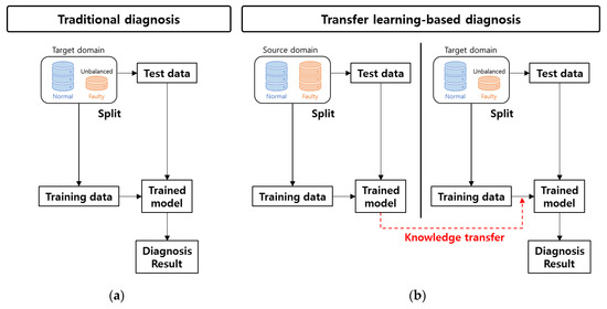 Figure 1. Flowchart of fault diagnosis: (a) traditional machine learning-based approach, and (b) transfer learning-based approach [15].