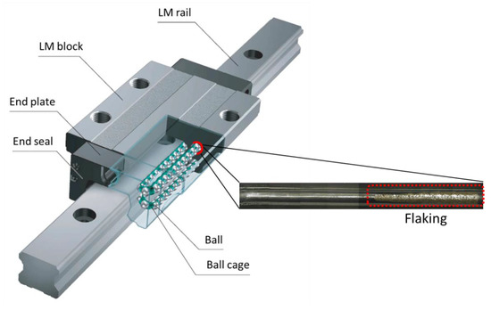 Figure 2. Linear motion (LM) guide structure and flaking inside the LM block.