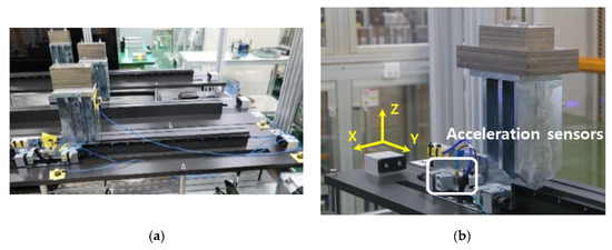Figure 3. Experimental setup: (a) linear motion guide test rigs; (b) installed accelerometer.