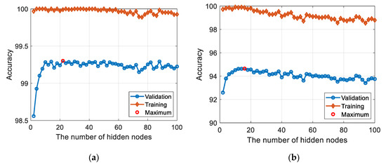 Thirteen time-domain statistical features as listed in Table 2 are extracted from the raw signals in the three directions, which gives the thirty-nine features. These are used as the input nodes of the NN. In terms of the architecture, a single hidden layer is considered with the transfer function being the hyperbolic tangent sigmoid. The optimum number of nodes in the hidden layer is then sought by the validation process, more specifically the five-fold cross-validation in practice. To this end, the datasets are divided into the five folds, in which the four are used for the training (determining the weights and bias of the network), while the remaining one is used for the validation. The diagnosis accuracy is then calculated by the ratio of the number of correct classifications to the total number of validation datasets. Since there are five folds, this is repeated five times, from which the average accuracy is obtained. Furthermore, since the NN solutions can vary widely due to the random initial conditions, this is repeated 300 times, and the grand average is obtained accordingly. The process is repeated by increasing the number of nodes in the hidden layer from 2 to 100 by increments of 2 (e.g., 2, 4, 6 …, 100). The result of validation in the source domain is given in Figure 6a, where the optimum number of hidden nodes is chosen at 22 by visual inspection. Once this is done, the NN is trained again to obtain the parameters (weights and bias) under the optimum architecture (namely, 22 hidden nodes) using the training datasets with initial values of the parameters given at random. Repeating this by 300 times, 300 sets of parameters are obtained for the NN in the source domain, which we call the pre-trained NN parameters to be used in the target domain. The reason for the repetition is due to the arbitrary nature of the NN solution.