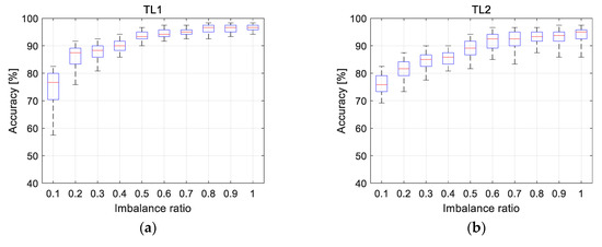 Once the NN is trained in the source domain, it can be exploited by TL in the target domain. There are two ways for this: One is named TL1, which uses the same architecture in the target domain as that of the source domain. The other is TL2, which, in addition to the same architecture, initial values for the training are given by the pre-trained NN parameters of the source domain. Whichever it is, the training is carried out using the architecture of the source domain by 300 times for the training datasets in the target domain as given in Table 1. In the training, the initial values of the parameters are assumed at random in TL1 whereas they are given by the pre-trained NN parameters in TL2. The trained NNs are applied to the test datasets of Table 1, from which the diagnosis accuracies are obtained as defined previously in the source domain. Since the 300 number of accuracy is obtained as a result, the accuracy is represented by the distribution, which occurs due to the randomness of NN solutions. Furthermore, the number of fault datasets vary by IR. So this is repeated for each IR from 0.1 to 1.0 by the increment of 0.1. Note that the smaller the IR, the more the data deficiency becomes greater.