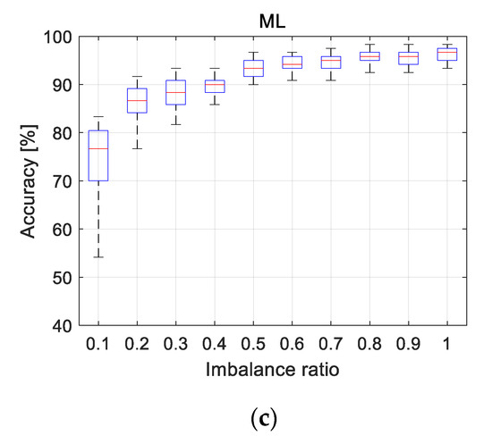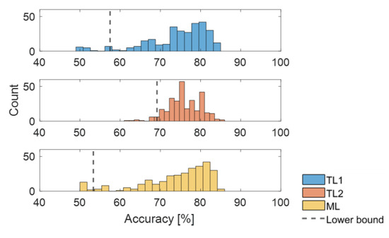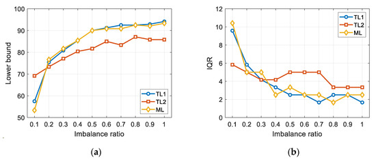 The results of accuracy distribution in TL1, TL2, and ML are given as a function of IR as shown in Figure 7a–c, respectively. In the figures, the bottom, top, and red lines of the box indicate the 25th, 75th percentile, and median of the distribution, respectively. The top and bottom of the extended dotted lines are the 5th and 95th percentiles. In Figure 8a,b, the lower bound (fifth percentile) and the IQR between 25th and 75th percentiles are shown, which indicate the lower confidence limit of accuracy and the degree of statistical dispersion, respectively [18]. When the IR is 0.1, the lower bound of TL2 is 69.2, which is greater than 57.5 (TL1) and 53.3 (ML), and the IQR is 5.83, which is only about 60% of 9.58 (TL1) and 10.41 (ML). The higher the bound and the lower the IQR, the better the performance. This can be identified more clearly in Figure 9, where the histograms of diagnosis accuracy and its lower bound are displayed for TL1, TL2, and ML, respectively. While the histograms of TL1 and ML are similar and show much larger variance, TL2 shows smaller variance with greater lower confidence limit. However, as the IR increases greater than 0.1, the lower bound and IQR of TL2 are not superior to the others. The authors believe that these results are due to the negative transfer [10], which happens when the fault characteristics between the source and target domain are quite different. In that case, adding the fault data in the target domain does not help to improve the TL performance. Overall observations are summarized as follows: (1) TL1 and ML behave similarly, whereas TL2 is different from the others. That is, the initialization of NN parameters is of more importance than the adoption of source domain architecture in making the difference of TL from ordinary ML in the target domain. (2) TL2 is superior to ML and TL1 only when the number of fault data is very small such as when IR is 0.1 or less as is evident in Figure 8, in which the lower bound of accuracy for TL2 is higher and the IQR for TL2 is shorter than the other two. This is why TL is necessary for the case when the data are too few to train by their own. (3) It is of surprise that TL2 is soon found less effective than the other two as the IR gets greater than 0.1. Nevertheless, it should not be overlooked that the proposed approach is truly useful in the case of significant data deficiency, which is the highlight of the study.