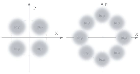 For the prepare-and-measure (PM) version of CVQKD that can be used for practical implementations, Alice randomly draws n quaternary or octal variables, each corresponding to a coherent state of , where is a real positive number related to the modulation variance of coherent state given by [,,,,]. For and , we have the four-state DM source and the eight-state DM source, as shown in Figure 1 [,].