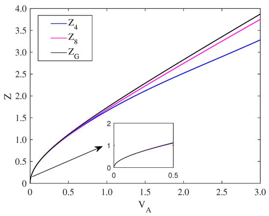 We note that the DM source has a positive effect on CVQKD. For example, we have for and in the DM–CVQKD protocol, where represents the GM–CVQKD protocol. However, it is difficult to distinguish , and for , as shown in Figure 2. Therefore, we attempt to derive the security bounds of DM–CVQKD referring to that of GM–CVQKD.