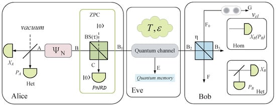 It is known that ZPC, which is a non-Gaussian operation with zero-photon state input/output [,], can enhance the correlation of the two-participant entangled quantum system [,]. In what follows, we suggest an improved CVQKD system with ZPC operation for the DM source preparation, as shown in Figure 3. In the auxiliary mode C, the zero-photon Fock state is injected at one input port of beam splitter (BS) with transmittance , and quantum state of the mode B is simultaneously injected at another input port. Subsequently, we detect the zero-photon Fock state at one of the output ports of the BS using a photon number resolving detector (PNRD), resulting in the ZPC-enhanced quantum state from another output port.
