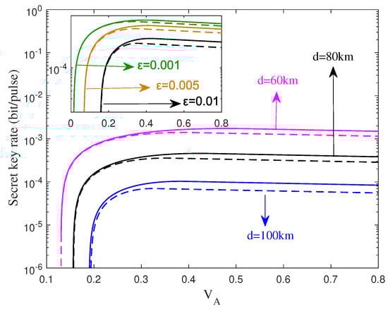 As usual, it is necessary to select an optimal modulation variance for the performance improvement of CVQKD involving the ZPC operation. As shown in Figure 5, solid lines denote the secret key rate of the eight state CVQKD system, while dashed lines represent that of the four-state CVQKD system. In addition, we let , and . We find that for , the secret key rate decreases as the transmission distance, while the inserted subgraph shows that the secret key rate decreases with the excess noise at the distance of 80km. Moreover, for the secret key rate can reach the optimal value, and hence we let in the subsequent simulations.