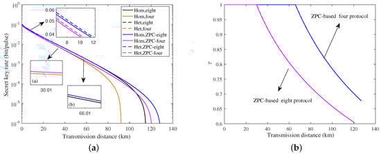 (a) Asymptotic secret key rate of DM–CVQKD involving the ZPC operation for , where solid lines denote homodyne detection, while dashed lines heterodyne detection. (b) Corresponding to (a), the transmittance varies with the transmission distance.
