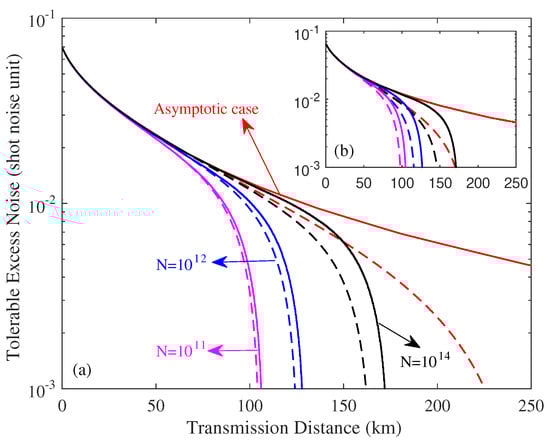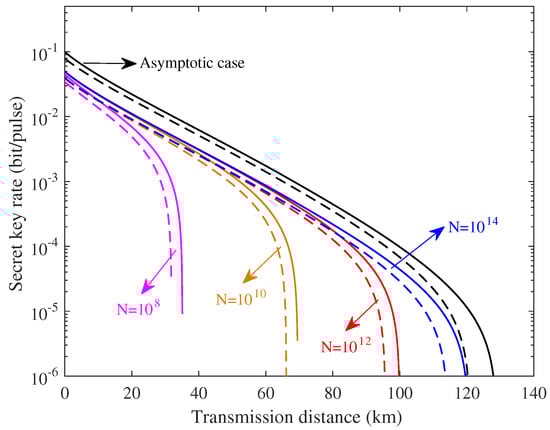As for the performance analysis of the proposed DM–CVQKD system, we take into account the asymptotic case [] where the secure key rate can be obtained via the covariance matrix approach. It is a theoretically calculated value without involving the finite-size effect. Unfortunately, the derived upper bound is difficult to obtain in practical implementations. Therefore, we have to consider the finite-size effects [,]. Though the secure key rate is still pessimistic, it approaches to the practical implementation. Its security analysis is based on the finite-size effects; hence, we can achieve the upper bound of the maximal transmission distance.