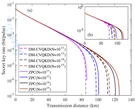 Usually, one assumes that the quantum channel is given in an asymptotic regime. However, one does not know the quantum channel in advance in the finite-size scenario. Therefore, we take into account effect of the finite-size on the ZPC-based CVQKD. As shown in Figure 7, the proposed CVQKD system in finite-size scenario performs worse than that in the asymptotic limit. As the number N of the exchanged signals is increased, the corresponding curves approach to the asymptotic scenario. The reason is that the large number of the exchanged signals results in the perfect signals parameter estimation. However, it is infeasible to achieve the infinite number of the exchanged signals in practice. Nonetheless, it still has resulted in an improvement, compared with the traditional system in the finite-size regime, as shown in Figure 8.