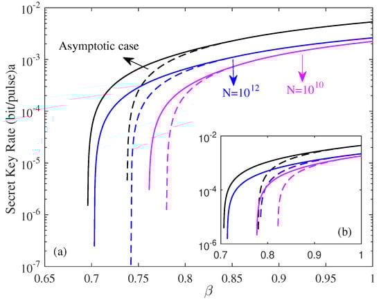 In this section, we demonstrate the effect of the DM source preparation on CVQKD in both asymptotic [,] and finite-size cases [] with numeric simulation results. For the detailed derivation of the secret key rate of the CVQKD system in asymptotic and finite-size cases, please see Appendices Appendix A and Appendix B, respectively.
