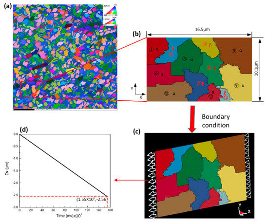 The model was developed from an EBSD image. The local area selected was 16.5 μm × 10.1 μm (see Figure 2a). The area consisted of 12 grains, including seven α-phase grains and five β-phase grains. The grains were numbered (i.e., ①, ②, ③, and so on) and the excel file including crystal structure, centroid position, Euler angles (φ1, ϕ, φ2) was output by channel5 software. Based on the RGB values of the image pixels, a 2D finite element model was developed. However, the 2D model used the plane strain or plane stress assumption, which may affect the accuracy of the simulation. Therefore, a unit thickness finite element model was established with 8-node 3D hexahedron solid elements, using the microstructure-based finite element model construction software developed by our group [27] (see Figure 2b), so it is called a 2.5D finite element model [19,28], which can reduce the calculation time and well reflect the actual situation. Each grain was considered as a single crystal, with a uniform crystallographic orientation, and its Euler angle was determined by centroid result. The model was meshed into 165 × 101 × 1 elements, with each element having dimensions of 0.1 μm × 0.1 μm × 0.1 μm. To simulate the quasi-static tensile experiment, boundary conditions were defined to obtain a uniaxial average stress state while upside and downside were a traction-free surface. Then, homogeneous normal displacement, i.e., in the loading direction X, was prescribed on left side in order to correspond to strains imposed during the experiments described in Figure 2d, which produced a displacement of 2.56 μm at 1.55 × 105 ms. Constraints on right side are defined in order to keep the face in stationary state. Finally, a total of 155 steps of loading were performed while the total deformation was 15.5%, and the commercial software Ansys/LS-Dyna was used to simulate the deformation process. Besides, we expanded the functions of Ansys/LS-Dyna [29] and the specific process is as follow:
