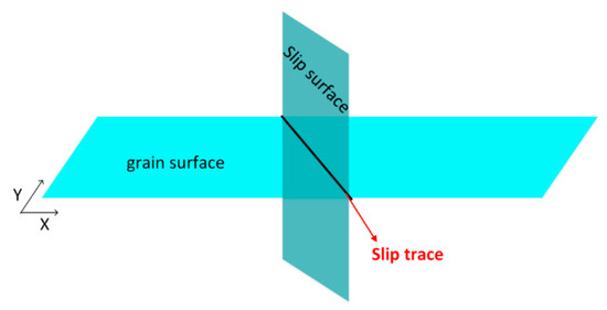 The slip trace was the intersecting line between the slip plane and the grain surface (the X-Y plane in this study), as shown in Figure 4. Fitting the slip systems and the rotation matrix g can transfer the slip plane from the crystal coordinate system to the sample coordinate system. A slip trace can be determined when the slip plane intersects with the grain surface and the angle between the simulation slip trace and X-axis is calculated, which should be compared with the experiment result.
